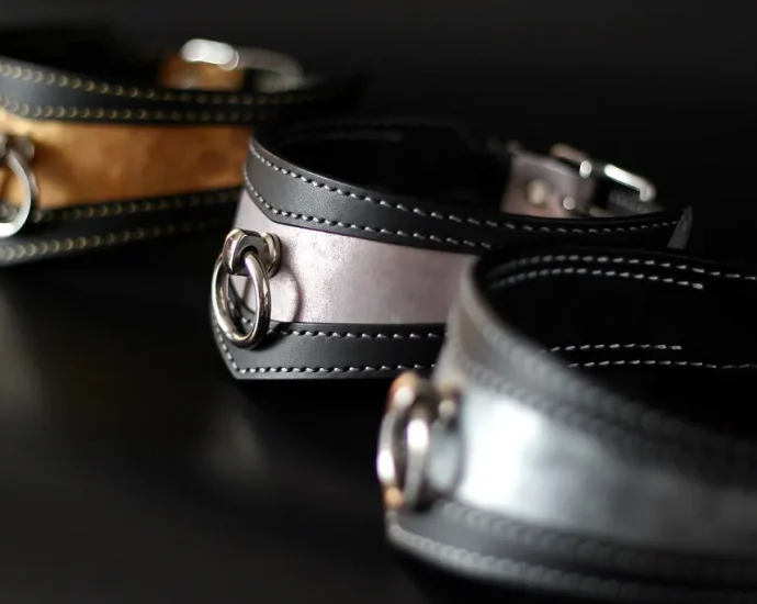 La collection de collier BDSM Visor Mk1 en cuir irisé/nacré est complète et disponible.